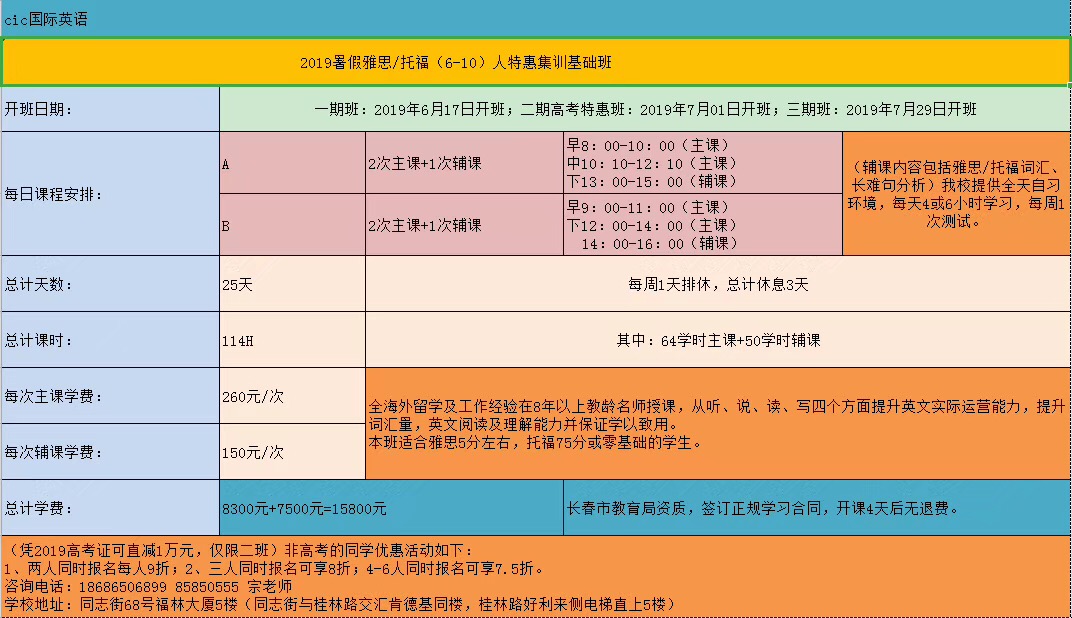 2019暑假特惠集训班火爆招生,约上你的小伙伴到CIC国际英语,给头脑充个电,雅思、托福班课期待你的到来。详情请致电我校。
